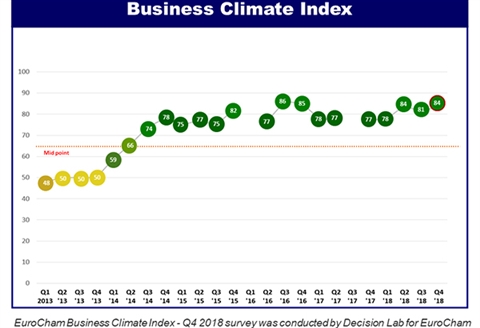 EuroCham members were more positive about their business situation in Q4, with 76% describing their business situation as either ‘Excellent’ or ‘Good’, up 8 percentage points compared to the previous quarter. Meanwhile, more than 7-out-of-10 business leaders were optimistic about the future, with 74% anticipating a positive start to 2019.