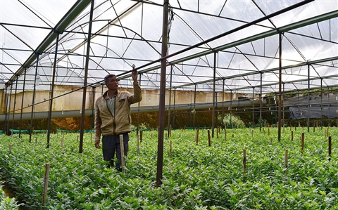 Nhà nông Lê Văn Hải với thiết bị đưa hoa cúc lên điện toán đám mây ở Làng hoa Thái Phiên, Đà Lạt. Ảnh: V.V |