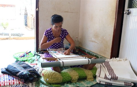 Chị Ka Hà khéo léo bên tấm thổ cẩm cho khách |