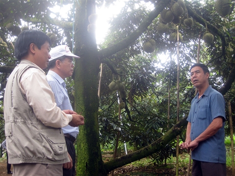 Tỷ phú Nguyễn Nghĩa Nam (bên phải) đang giới thiệu mô hình trồng sầu riêng với lãnh đạo huyện Di Linh. Ảnh: T.D.Hồng |