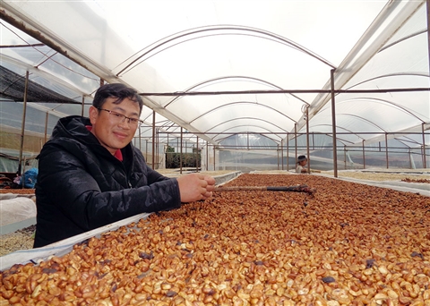 Không chỉ mua máy, HTX còn đang xây dựng 2 ngàn mét vuông sân phơi bên cạnh 2 ngàn mét vuông đã sử dụng từ niên vụ trước. Trong giàn nhà kính cao vút, những sàn phơi cà phê được làm 3 tầng, tiết kiệm diện tích và tăng khả năng phơi. Trong nhà phơi có đủ máy móc đo ẩm độ, nhiệt độ, có thể đáp ứng nhu cầu phơi 150 tấn nhân cà phê.