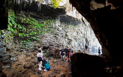Bù lại lối vào hiểm trở, bên trong hang Gió rộng rãi, sâu hun hút. Không gian hang ẩm ướt quanh năm, rong rêu bám xanh trên vách đá.