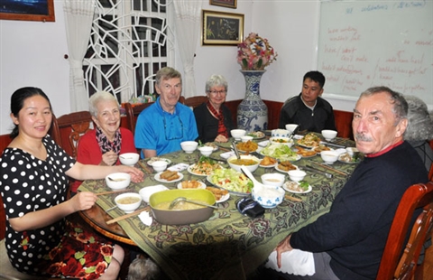 Ông bà Gerard và Linda Zschoche (thứ ba, thứ tư từ trái qua) cùng các thành viên trong nhóm du lịch của mình trong bữa cơm tối tại nhà một người dân ở Đà Lạt |