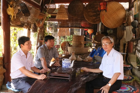 Ông Lê Quang Thiện - Giám đốc Trung tâm VHTT&TT huyện Đạ Tẻh (ngoài cùng bên trái) trong một dịp đến thăm, tìm hiểu về “Bảo tàng làng quê Quảng Trị” thu nhỏ. Ảnh: L.Trọng |