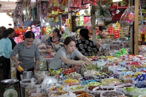 Các sản phẩm phục vụ tết được bày bán đa dạng trong khu vực Chợ Tùng Nghĩa, Đức Trọng đáp ứng nhu cầu mua sắm của người dân.