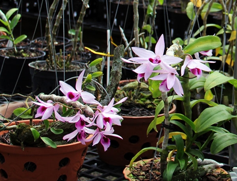 Chúng tôi đến với các chủ vườn lan ở huyện Di Linh để tìm hiểu và được biết, hiện một số Vườn lan Giả hạc Di Linh có tiếng. Đó là vườn lan Hạnh Đăng ở Tổ 18, thị trấn Di Linh; Vườn lan Đại Xuyên, Vườn lan Kim Ngân ở xã Đinh Lạc; Vườn lan Minh Quang, Kim Anh ở thị trấn; Vườn lan anh Nguyễn Văn Dũng ở xã Phú Hiệp… Khi chúng tôi có mặt tại vườn lan Hạnh Đăng, cô Hạnh đang cẩn thận đóng hàng lan cho khách mang đi tỉnh Đăk Nông còn anh Đăng dẫn mấy khách chơi tham quan và giới thiệu trong vườn lan rộng khoảng 500 m2 được phân ra nhiều tầng cao thấp khác nhau. Ngoài giá trị được phân biệt theo vùng và hình thể hay biến đổi gen như nêu ở trên, anh Đăng còn cho biết giá trị một giò phong lan Giả hạc được quan tâm đến rất chi tiết ở các bộ phận của hoa. Đó là cánh vai và đài phải dày, căng (gọi là sáp); khuôn bay (mềm mại, cong như cánh chim bay); mắt vừa đậm, xước (có gân) vừa mờ (chấm phá nhẹ), gọn, không lem; môi căng, có tuyết (lông tơ); mũi hồng, trắng, tím, tươi tắn, cân đối. Ngoài ra, các bộ phận khác cũng được soi xét kỹ như cựa, thùy đạt chuẩn; thân mập, chắc khỏe; lá tròn, dài, bóng nhựa, có sọc càng quý; đốt thân dày… Một bông phong lan đẹp nhìn tổng thể hoa phải đầy đặn, không cụp mà vươn lên một cách kiêu sa, quý phái và tràn đầy nhựa sống…