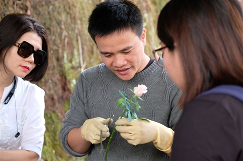 | Hoàng Đức tỉ mỉ hướng dẫn khách cách cắm từng loại hoa |