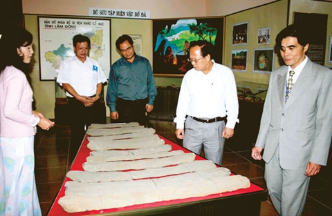 | Nguyên Bộ trưởng Bộ VH-TT-DL Hoàng Tuấn Anh thăm bộ đàn đá trưng bày tại Bảo tàng Lâm Đồng. Ảnh: Đoàn Bích Ngọ |