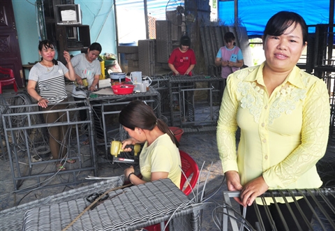 “Trước đây làm bèo, làm được 3 - 4 năm thì chuyển sang đan ghế dây nhựa như hiện nay” - chị Hường cho biết. Làm bèo có nghĩa là đan thủ công các dây bèo phơi khô gắn vào các khung sắt nhỏ định sẵn thành các vật dụng gia đình. Hàng bèo này, theo chị Hường nhiều năm nay có vẻ không chuộng, nên công ty chuyển sang hàng đan dây nhựa bàn ghế, cũng là đan thủ công. “Cũng có lúc có hàng khó nhưng cũng có lúc hàng dễ làm, công ty yêu cầu hàng gì thì mình làm nấy thôi” - chị Hường nói.