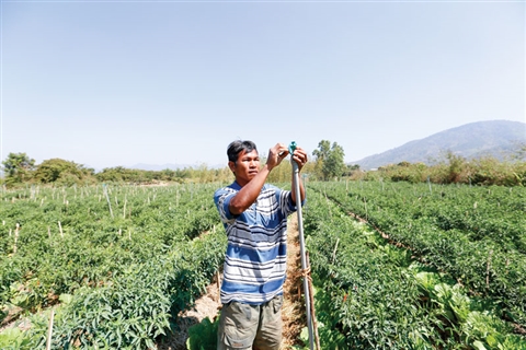 | Anh Rơ Jê Ha Mi chỉnh sửa bép nước để tưới cho vườn ớt, bắp sú |