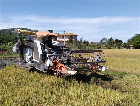 | Thu hoạch và vận chuyển thóc bằng máy móc tại thôn Hàng Làng, xã Gung Ré. Ảnh: D.Q |